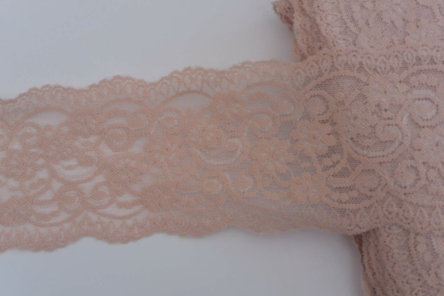 Persikorosa/gammelrosa elastisk spets. 10 cm bred