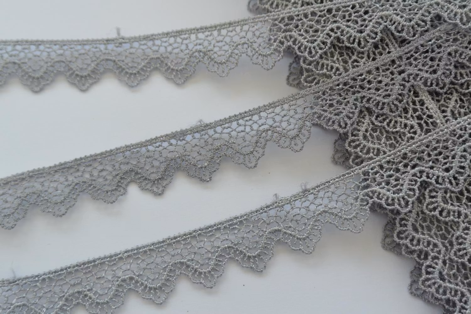 Grå spets. 17 mm bred. 76% viskos, 24% bomull.