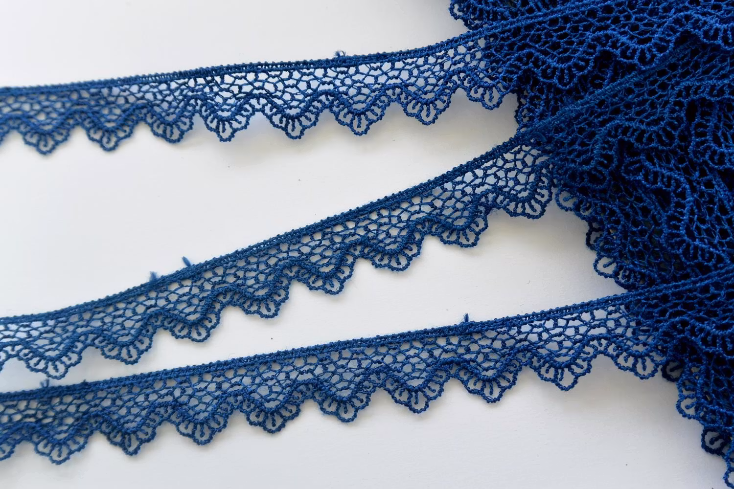 Mörkblå spets. 17 mm bred. 76% viskos, 24% bomull.