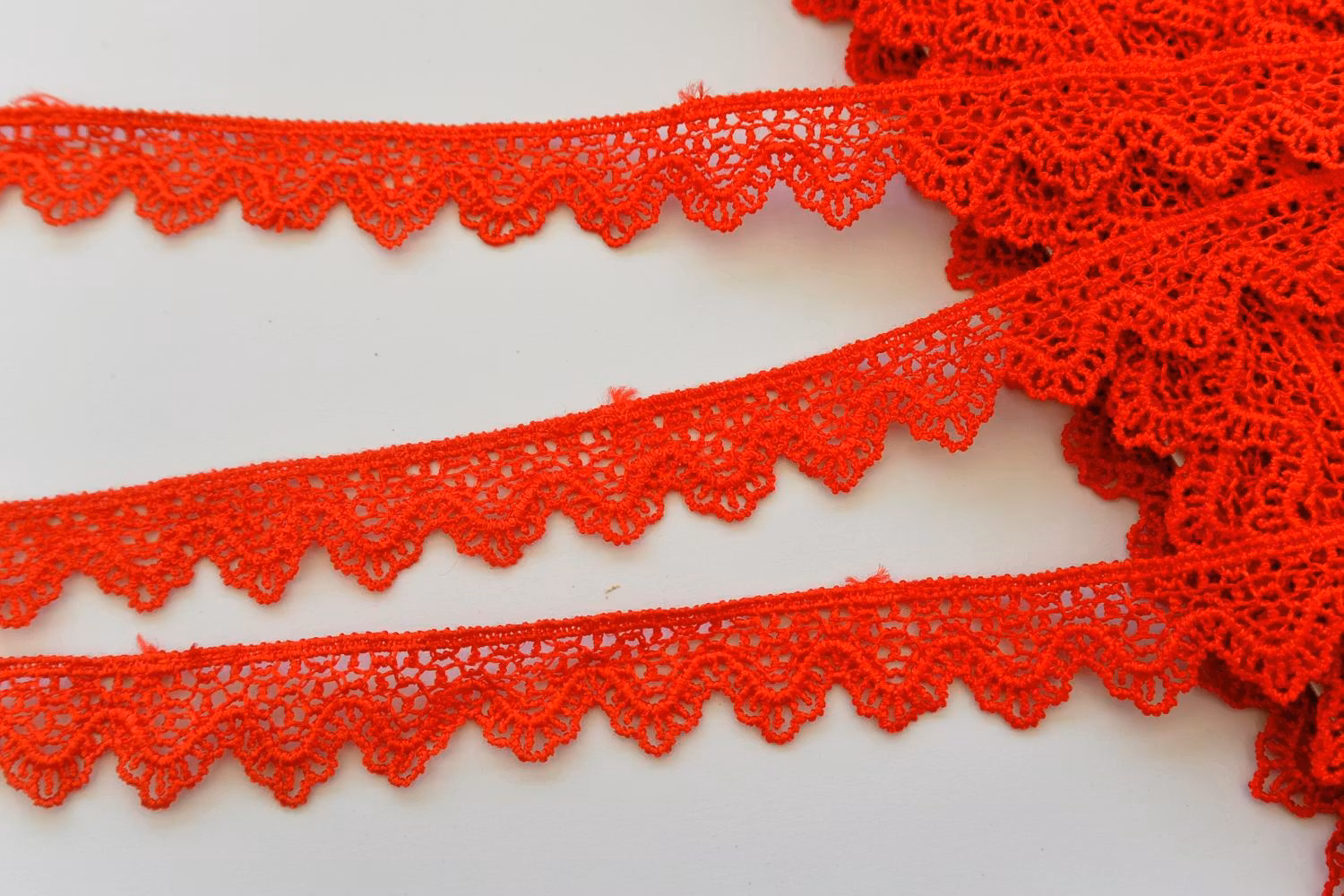 Röd spets. 17 mm bred. 76% viskos, 24% bomull.