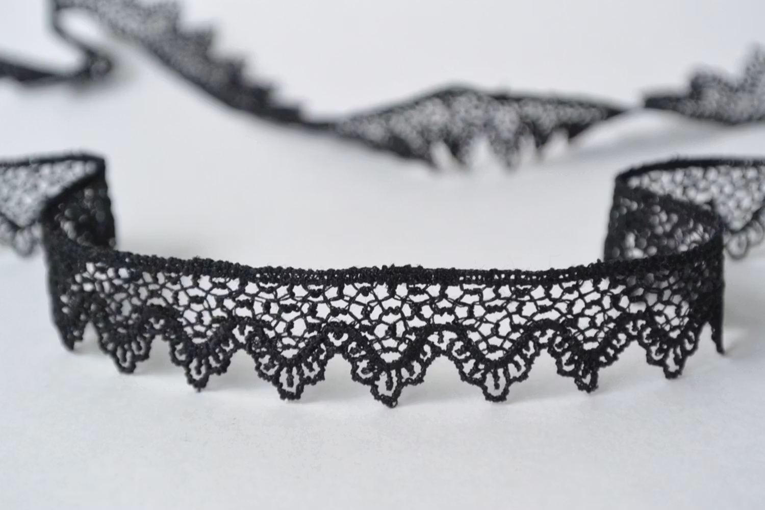 Svart spets. 17 mm bred. 76% viskos, 24% bomull.