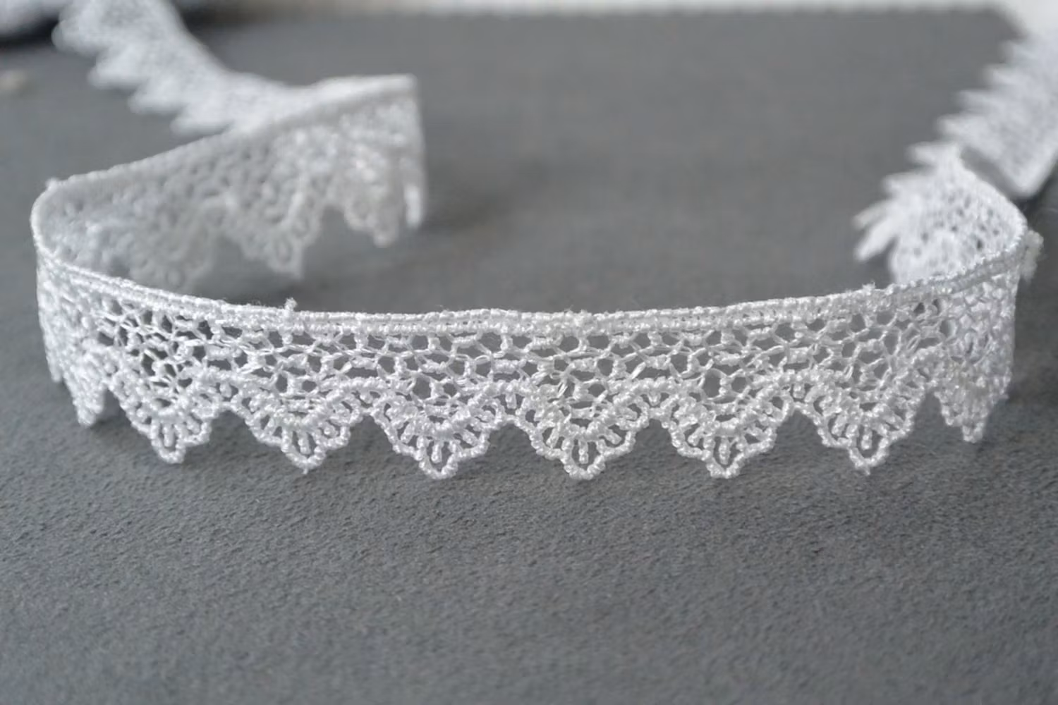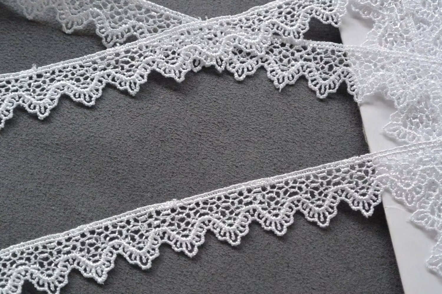 Vit spets. 17 mm bred. 76% viskos, 24% bomull.