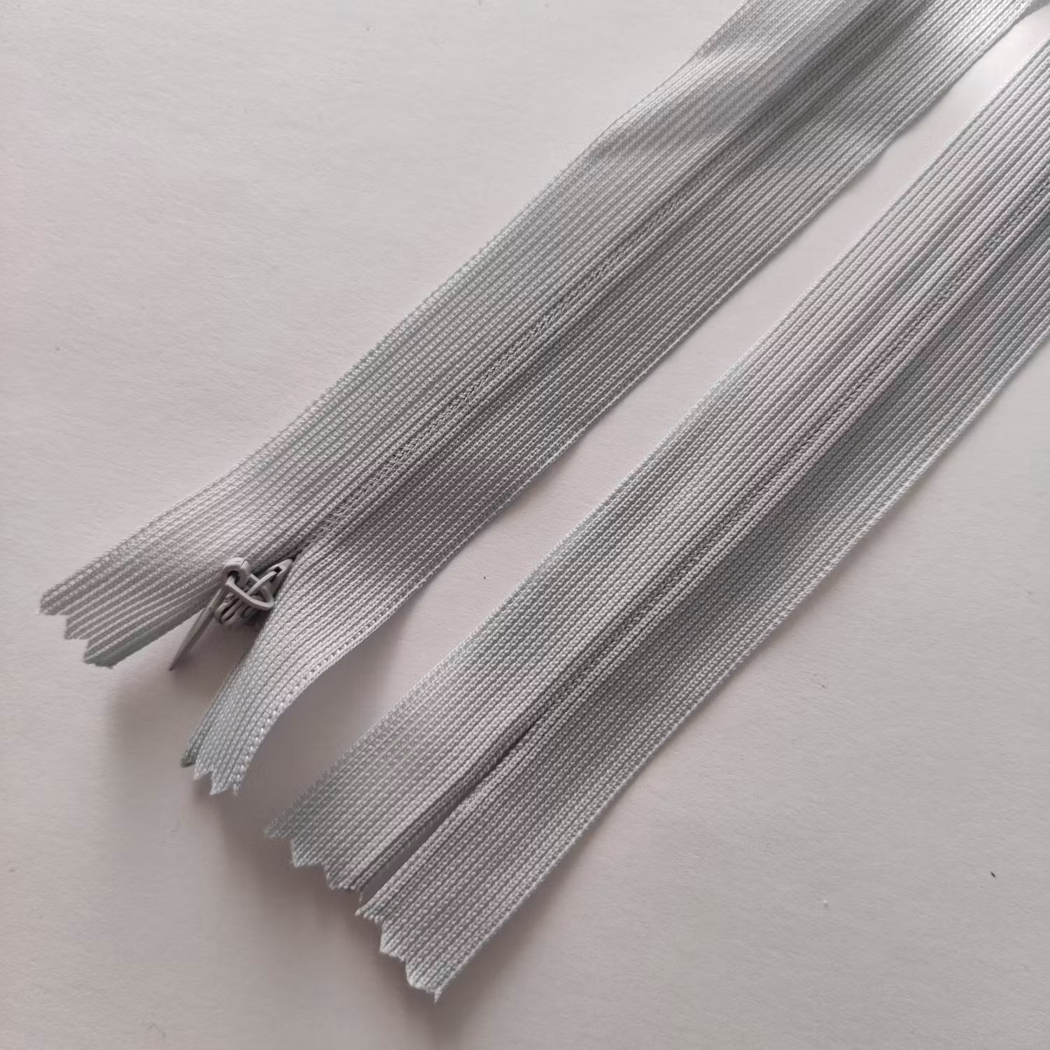 Odelbar osynlig spiral dragkedja, blixtlås. Ljus gråblå.