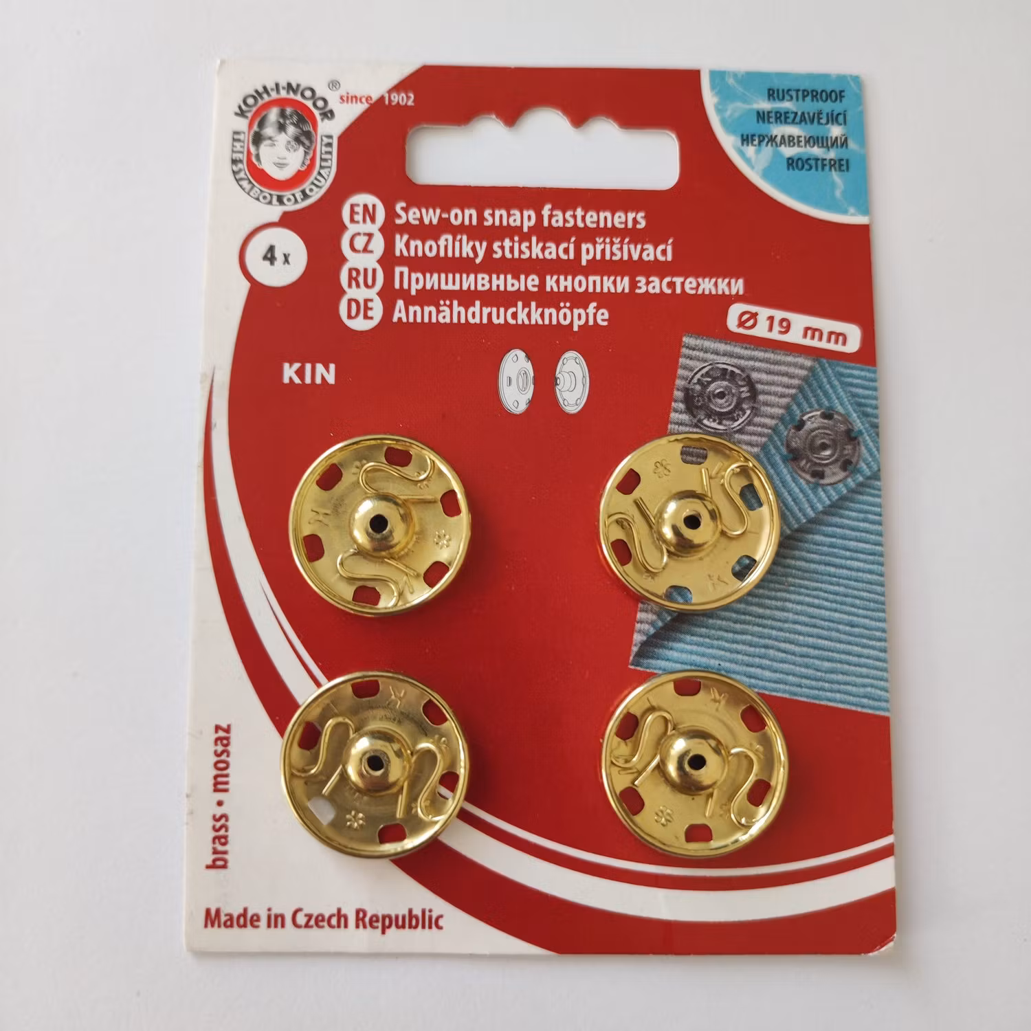 Rostfria tryckknappar att sy fast av metall, guldfärgade, 19 mm. Förp med 4 st.